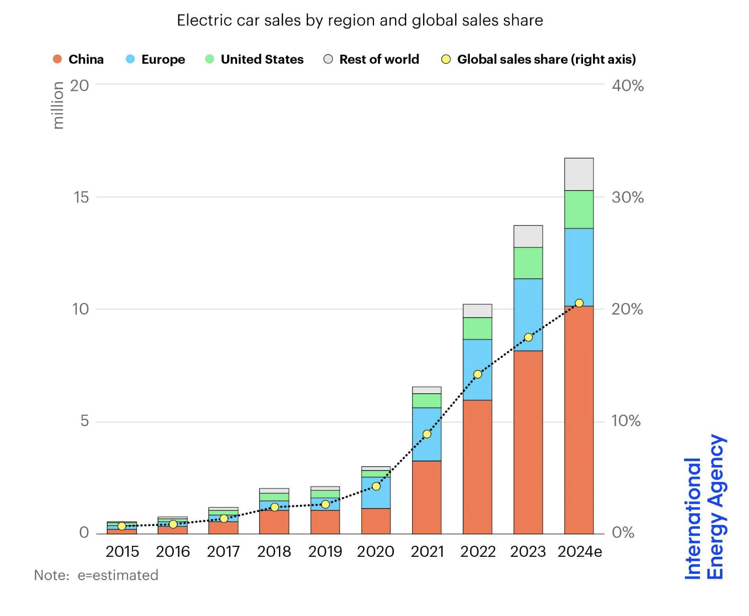As already alluded to, EVs continued their upward trajectory in 2024. Electric cars are gaining market share, with predictions suggesting they could account for 20% of total car sales by the end of 2024. Market share could exceed 11% in the USA, as much as 25% in Europe, and almost half – 45% – in China. We’re looking at nearly 17 million EVs sold this year, compared to just under 14 million last year – that’s an increase of 3 million units!