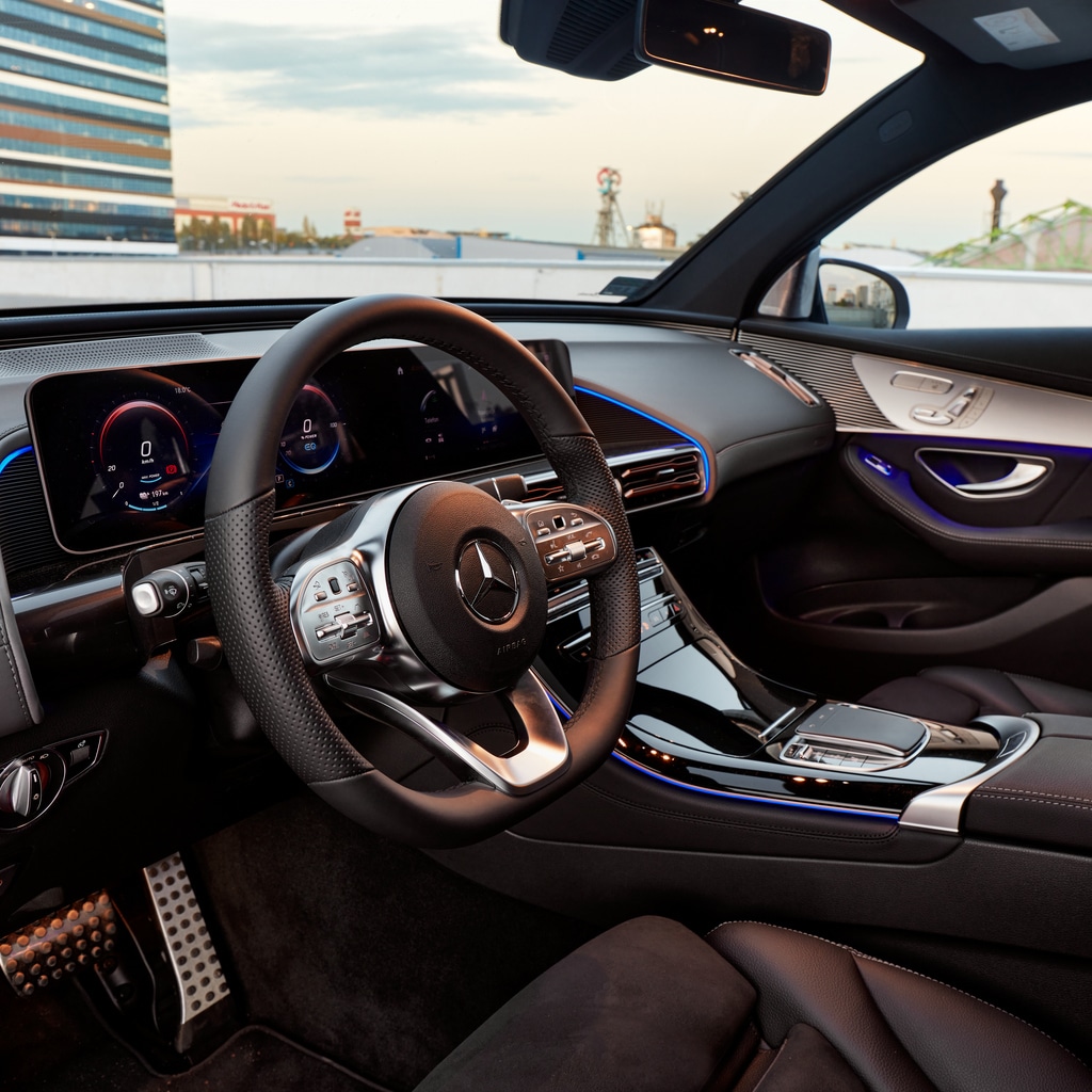 اختارت شركة مرسيدس الحرفين "إي" و"كيو" للإشارة إلى طرازات السيارات الكهربائية. ويشير الحرف الثالث "سي" إلى تكافؤ السيارات الكهربائية مع نظيراتها التي تعمل بالبنزين. بذلك تصبح سيارات مرسيدس "إي كيو سي" هي المقابل الكهربائي للسيارات الرياضية التقليدية (GLC SUV). وقد يكون من العدالة مقارنة سيارات مرسيدس بسيارة "بي إم دبليو - آي إكس" نظرا لتقارب السعر، رغم أن سيارة مرسيدس تسير نطاقا أقل عند حوالي 415 كم.