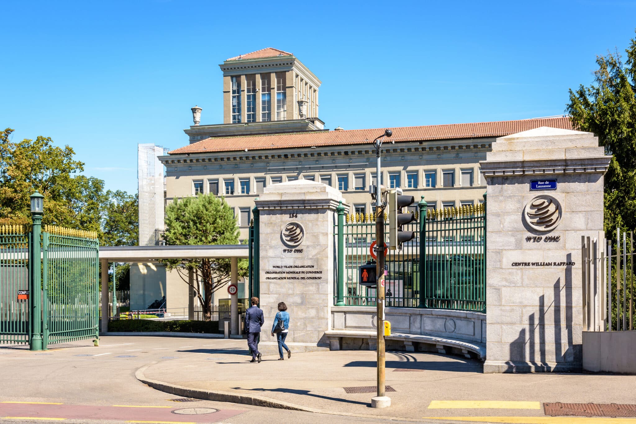 صورة من مدخل المقر الرئيسي لمنظمة التجارة العالمية – المعنية بتنظيم حركة التجارة الدولية.