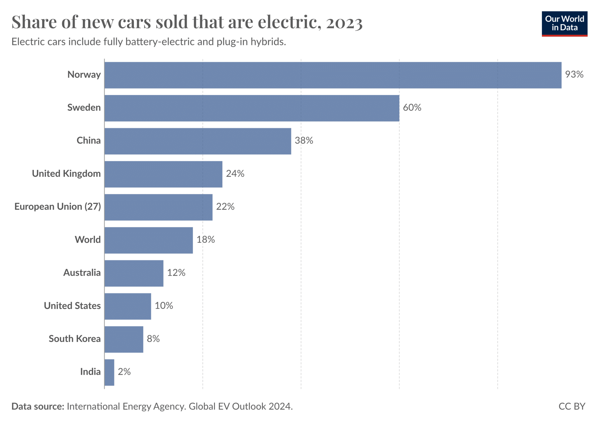 مع ذلك تنوعت معدلات تبني السيارات الكهربائية من بلد إلى آخر. ففي النرويج، كان أكثر من 90% من السيارات الجديدة كهربائية. وفي الصين 40% تقريبا؛ وفي الاتحاد الأوروبي 22%؛ وفي الولايات المتحدة 10% فقط.