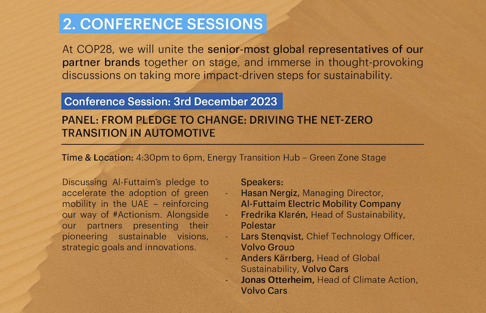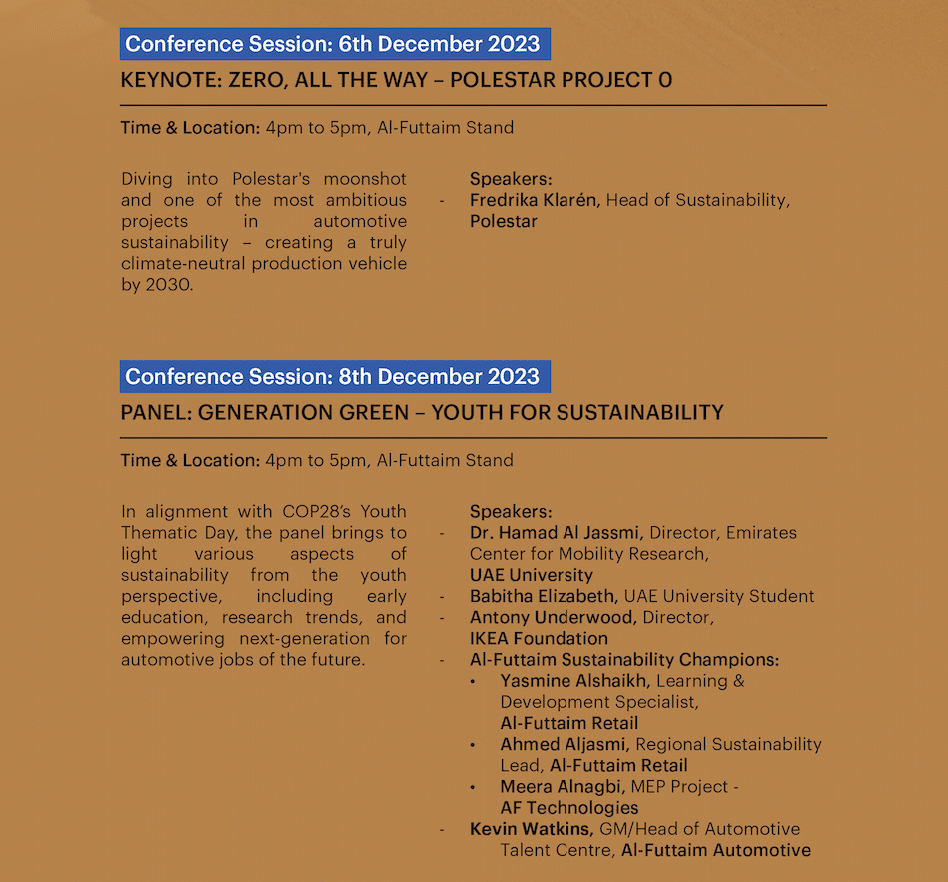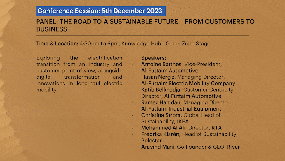 جلسة حوارية عن تعهد مجموعة الفطيم بتسريع وتيرة انتشار السيارات الكهربائية في الإمارات. وتضم اللجنة أعضاء من بينهم: فريدريكا كلارين، رئيسة قسم الاستدامة في شركة بولستار للسيارات، ولارس ستينكفيست الرئيس التنفيذي للتكنولوجيا في مجموعة فولفو، وحسن نرجس من مجموعة الفطيم. التفاصيل في الرابط أدناه.