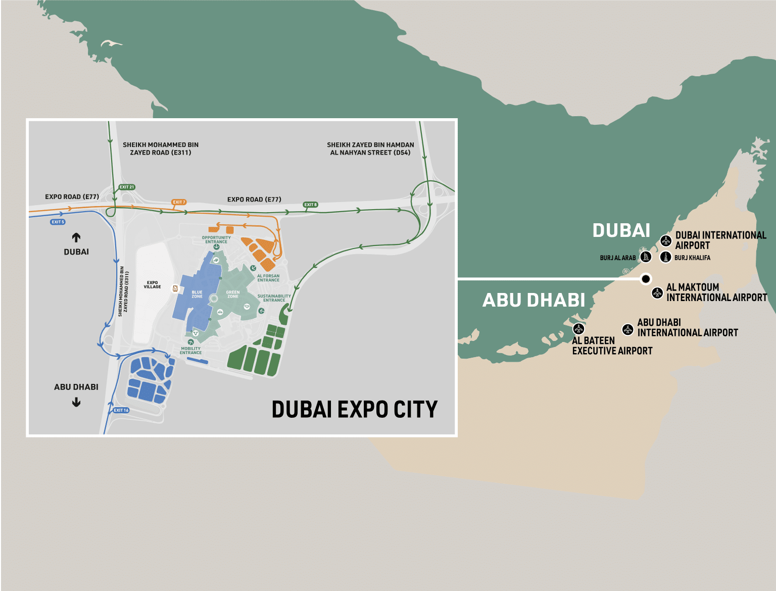 الوصول إلى المنطقة الخضراء. هناك العديد من الخيارات، مع المعلومات على موقع مؤتمر كوب 28. وهناك أيضاً خريطة تفاعلية للمنطقة الخضراء.