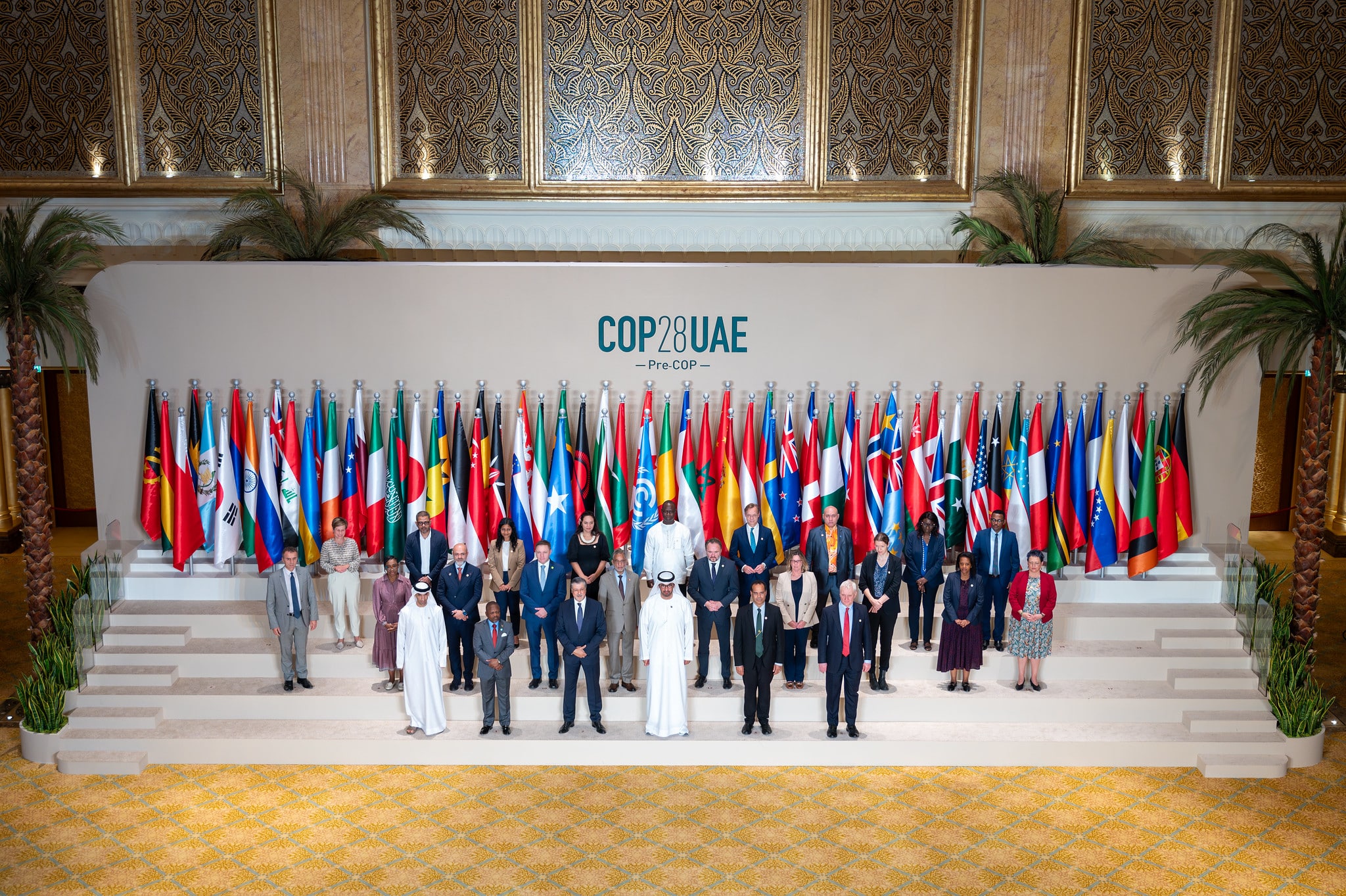 صورة تذكارية تجمع رئيس مؤتمر كوب 28 مع صناع القرار في مجال المناخ والوزراء والمؤسسات المالية الدولية وقيادات التمويل البيئي في أبو ظبي لحضور الاجتماع الوزاري الثالث للمناخ والتنمية في الحدث السابق لمؤتمر الأطراف.